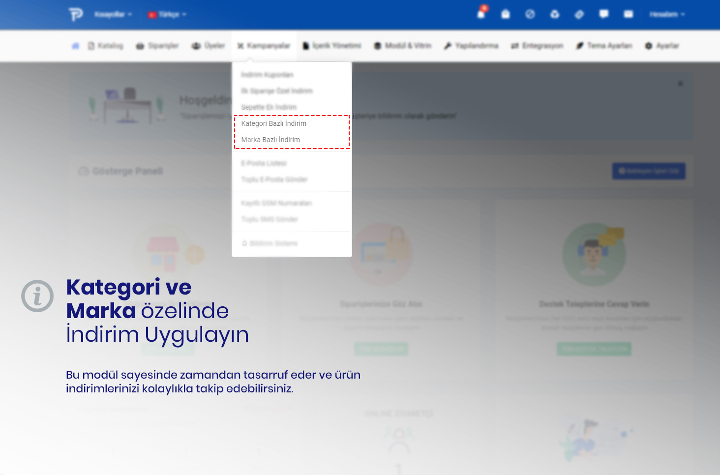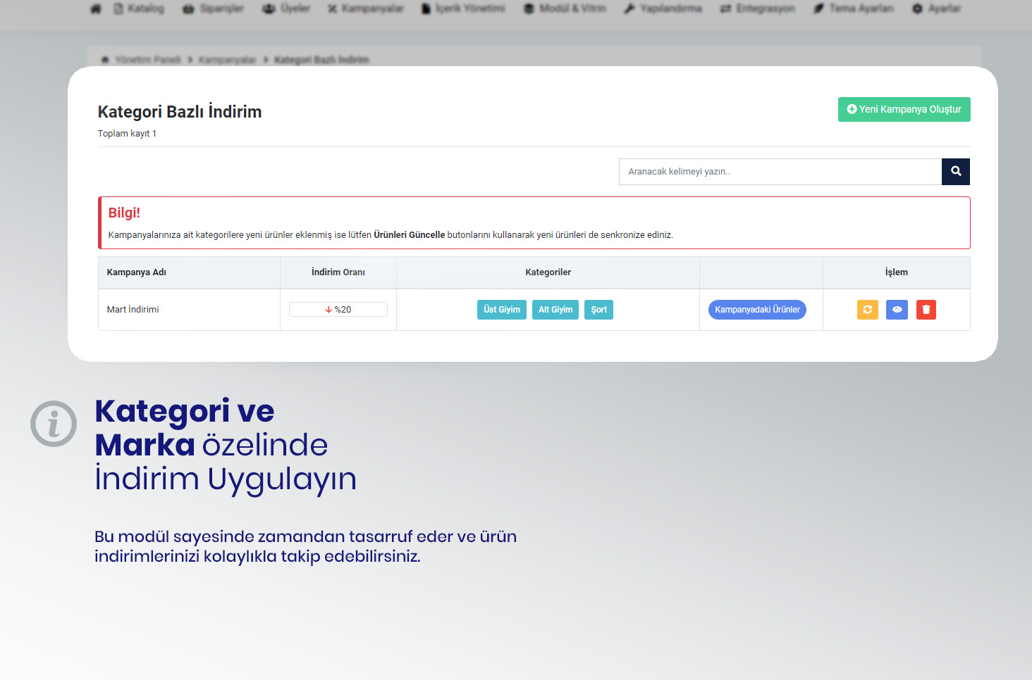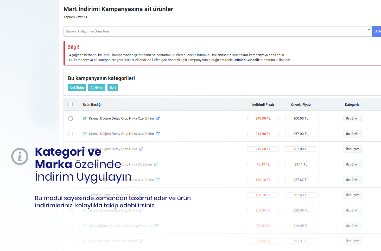 İndirimdeki ürünleri ilgili kampanyaların detaylarından görüntüleyebilir ve indirim öncesi ile indirimli fiyatlarını takip edebilirsiniz.Modül sayesinde marka veya kategorilerinize özel indirimler uygulayabilirsiniz.