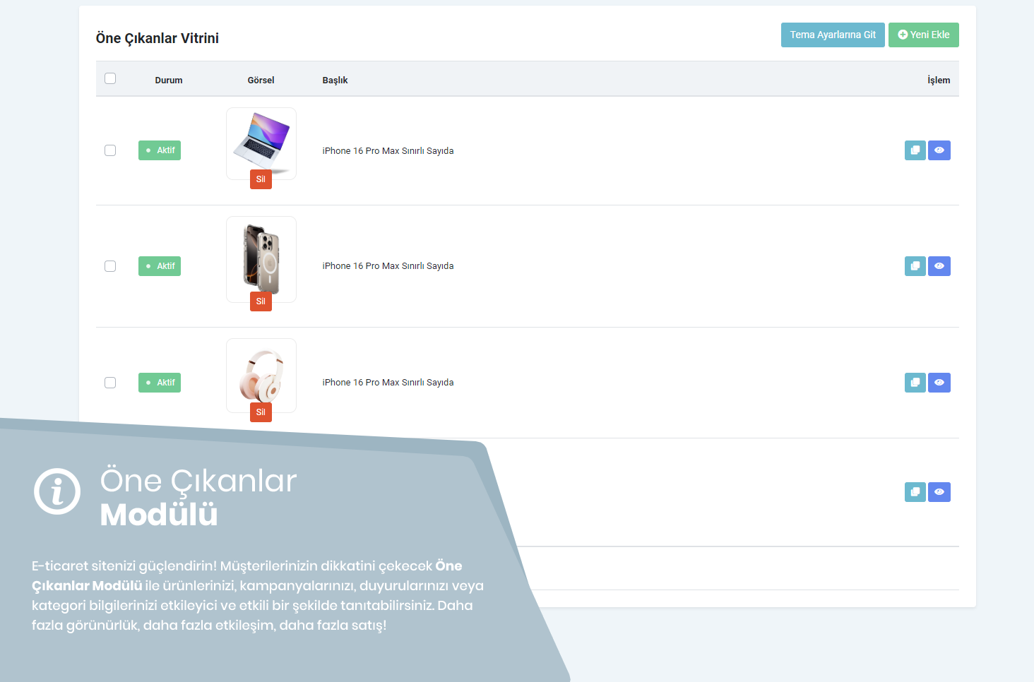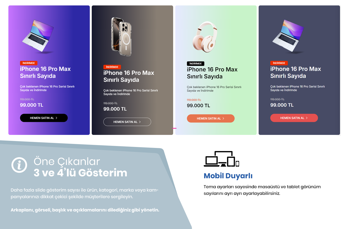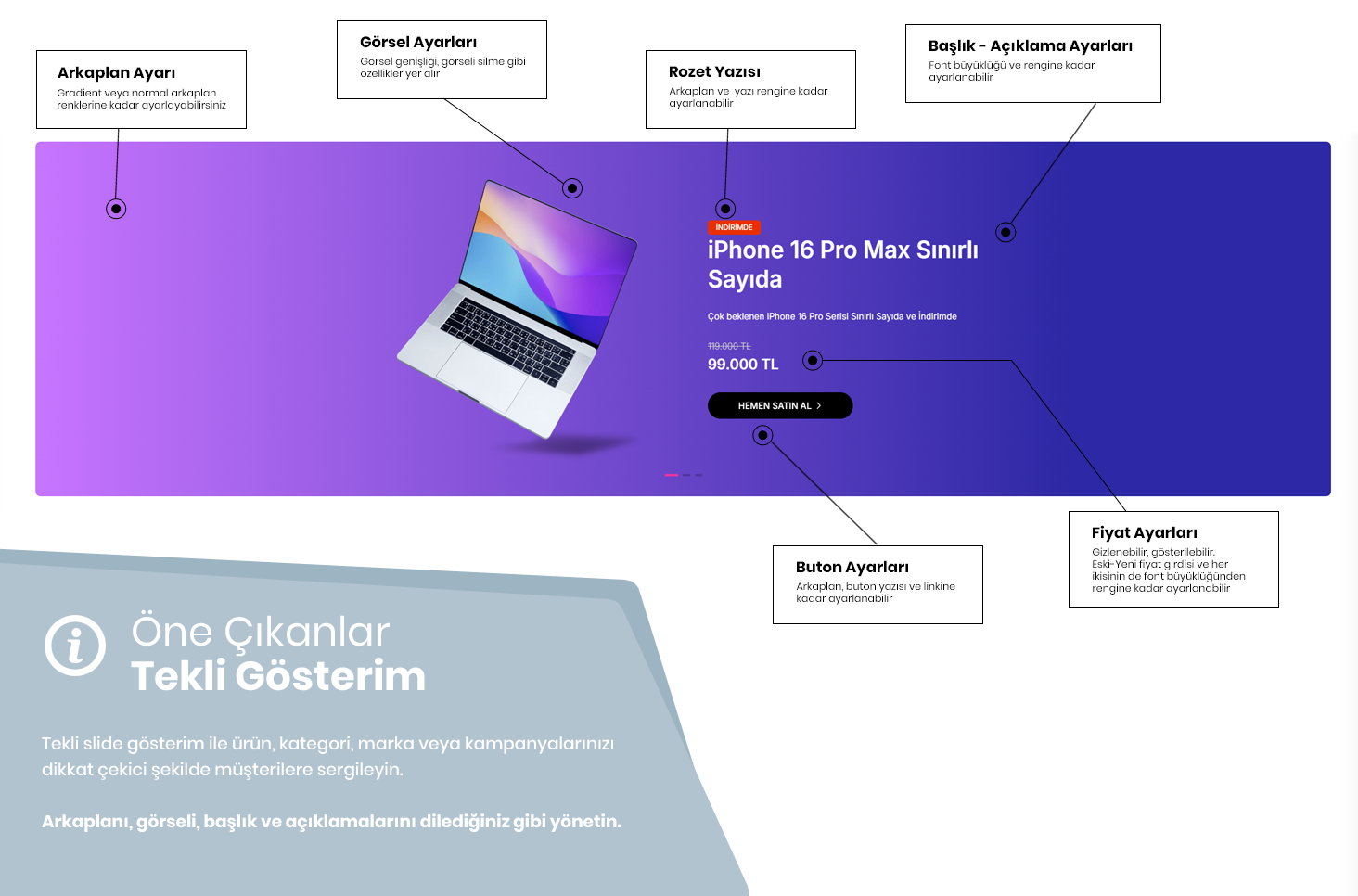 E-ticaret sitenizi güçlendirin! Müşterilerinizin dikkatini çekecek Öne Çıkanlar Modülü ile ürünlerinizi, kampanyalarınızı, duyurularınızı veya kategori bilgilerinizi etkileyici ve etkili bir şekilde tanıtabilirsiniz. Daha fazla görünürlük, daha fazla etkileşim, daha fazla satış!