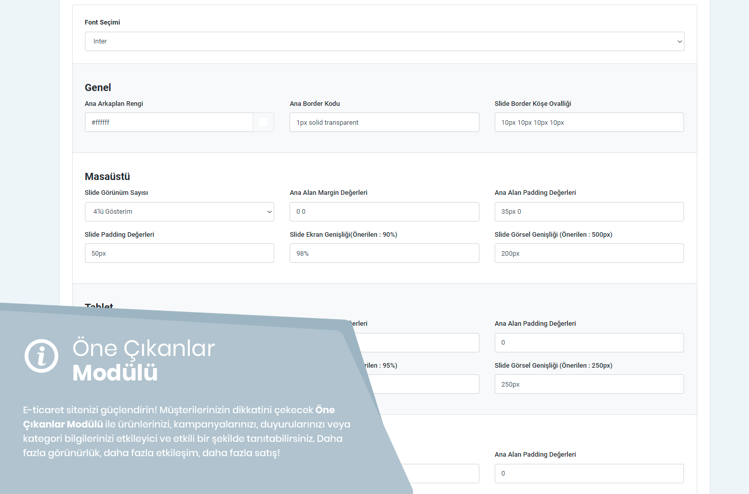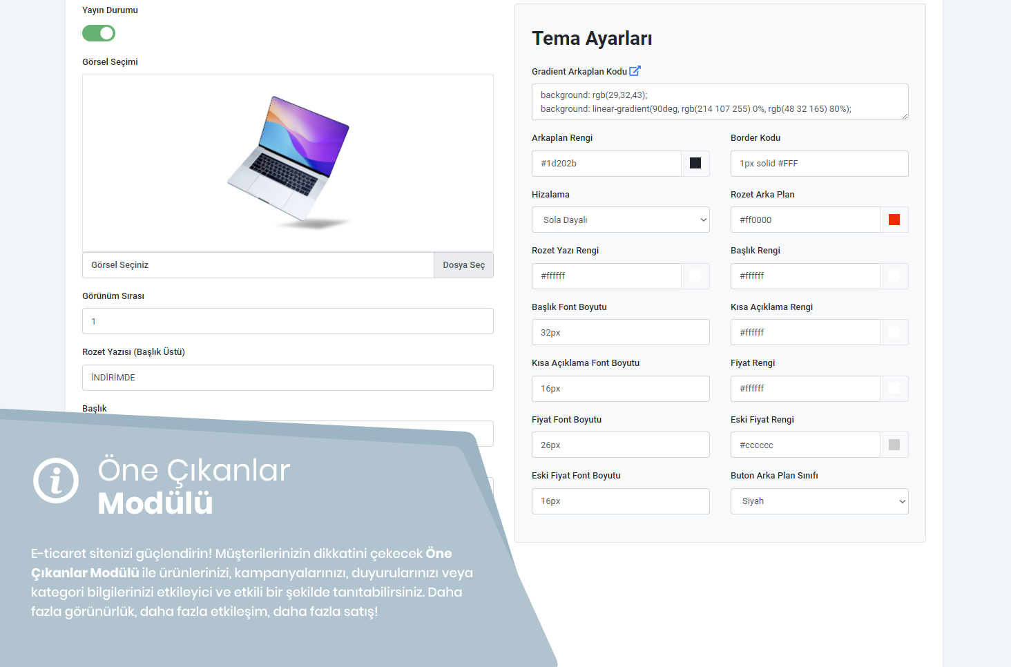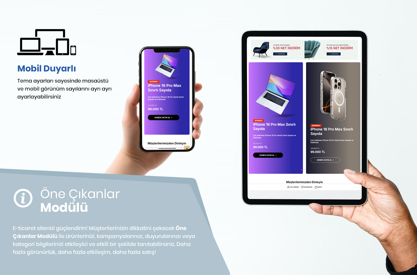 E-ticaret sitenizi güçlendirin! Müşterilerinizin dikkatini çekecek Öne Çıkanlar Modülü ile ürünlerinizi, kampanyalarınızı, duyurularınızı veya kategori bilgilerinizi etkileyici ve etkili bir şekilde tanıtabilirsiniz. Daha fazla görünürlük, daha fazla etkileşim, daha fazla satış!
